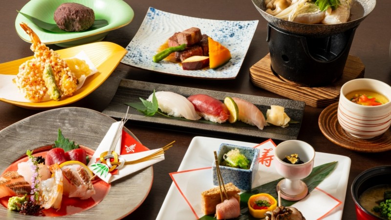 ~祝い肴七種と祝い鯛含むお造り盛り合わせや鯛出汁鍋