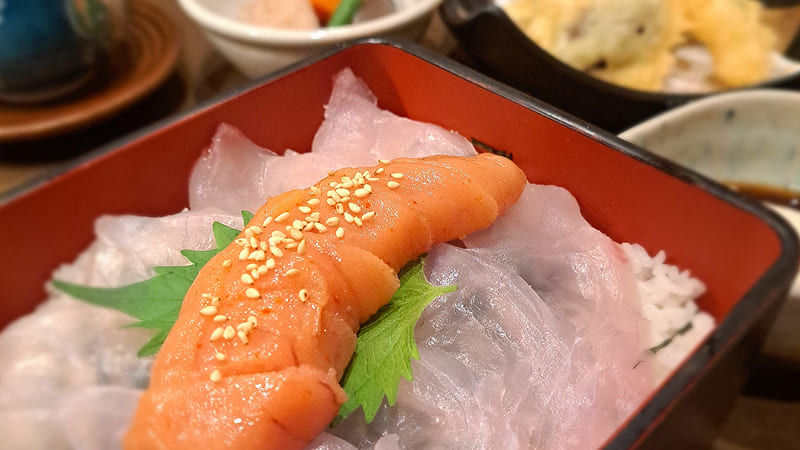 明太子一本と真鯛薄造りを炊き立ての九州産米にのせた贅沢な一品。
