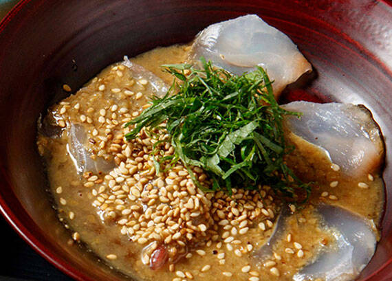 新鮮な真鯛の刺身を胡麻香る油ダレで上品な漬けに仕上げました。ひと口ごとに胡麻の豊かな香りと鯛の旨みが広がり、白米に乗せれば鯛胡麻丼として、鰹香る出汁を注げば鯛茶漬けとしてそれぞれの味わいをお楽しみいただけます。