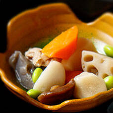 博多の食文化を受け継ぐ伝統の煮物「がめ煮」。旨味の軸となる出汁は鰹節と昆布をふんだんに使用して雑味のない澄んだ味わいに、手間を惜しまず鶏と椎茸の旨味を加え深みのある滋味に仕上げました。