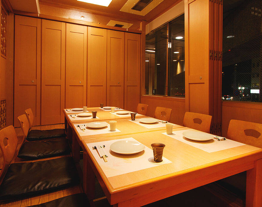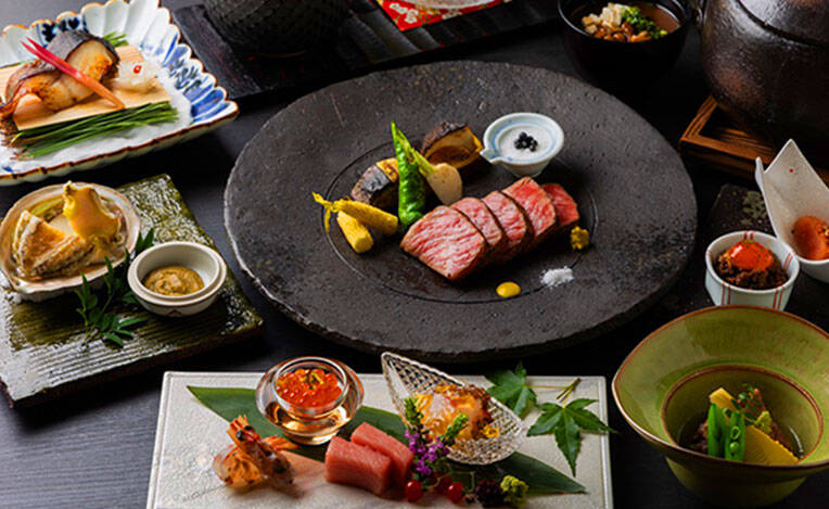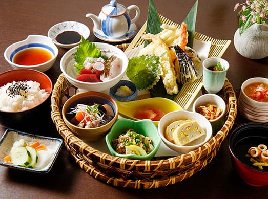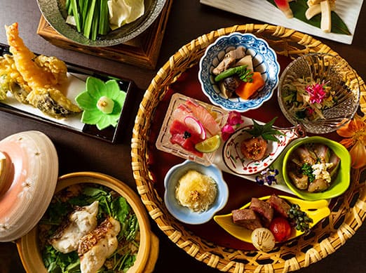 宿泊のお客様に博多ならではの手仕込み朝食、 そして昼と夜は九州産の魚介類や選りすぐりの食材をふんだんに使った創作料理を提供します。有名和食店で修業を重ねた料理人が腕をふるいます。四季折々の宴会コースに加え、本格和食会席も用意しております。